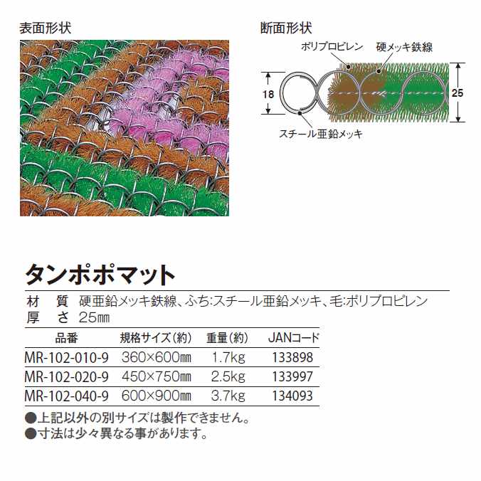 材質:硬亜鉛メッキ鉄線、ふち:スチール亜鉛メッキ、毛:ポリプロピレン 厚さ:25mm サイズ:約450×750mm 重量(約):2.5kg ●上記以外の別サイズは製作できません。
